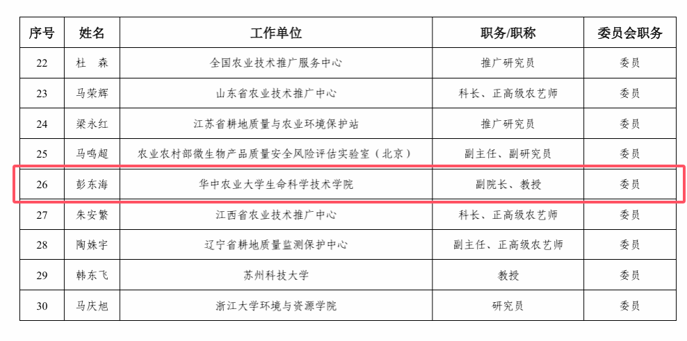 根据农业农村部网站公示,我中心副主任、技术负责人,华中农业大学生命科学技术学院教授彭东海担任第十一届农业农村部肥料登记评审委员会微生物肥料组委员。详见关于第十一届农业农村部肥料登记评审委员会组成人员名单的公示。