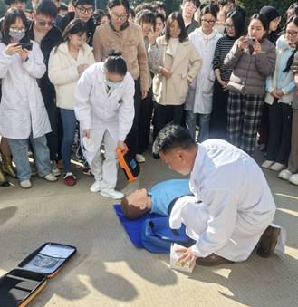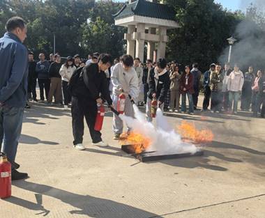 本次演习模拟实验室引发火情的场景。随着警报响起,应急疏散预案立即启动,员工们沿安全通道低姿、快速、有序地撤离至指定集合点。随后,校消防队员现场演示了干粉灭火器的正确使用方法,并指导员工进行了实操演练,确保“见火不慌,抬手就灭”。校医院医护人员还现场演示了紧急救援方案,教导员工们心肺复苏步骤和AED(除颤仪)的使用。